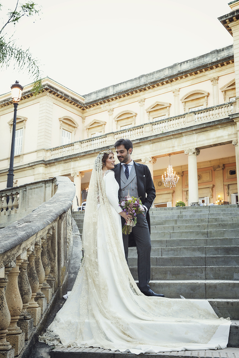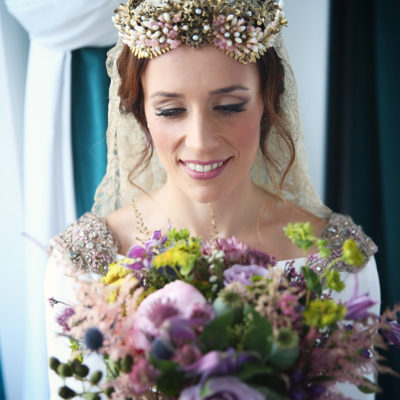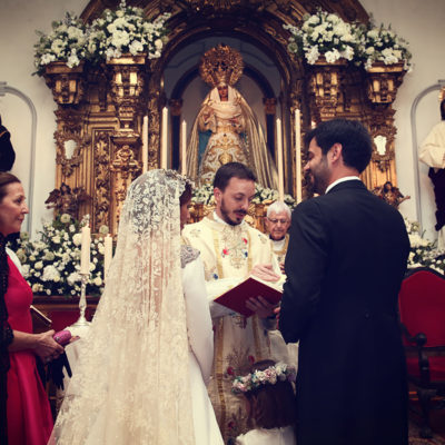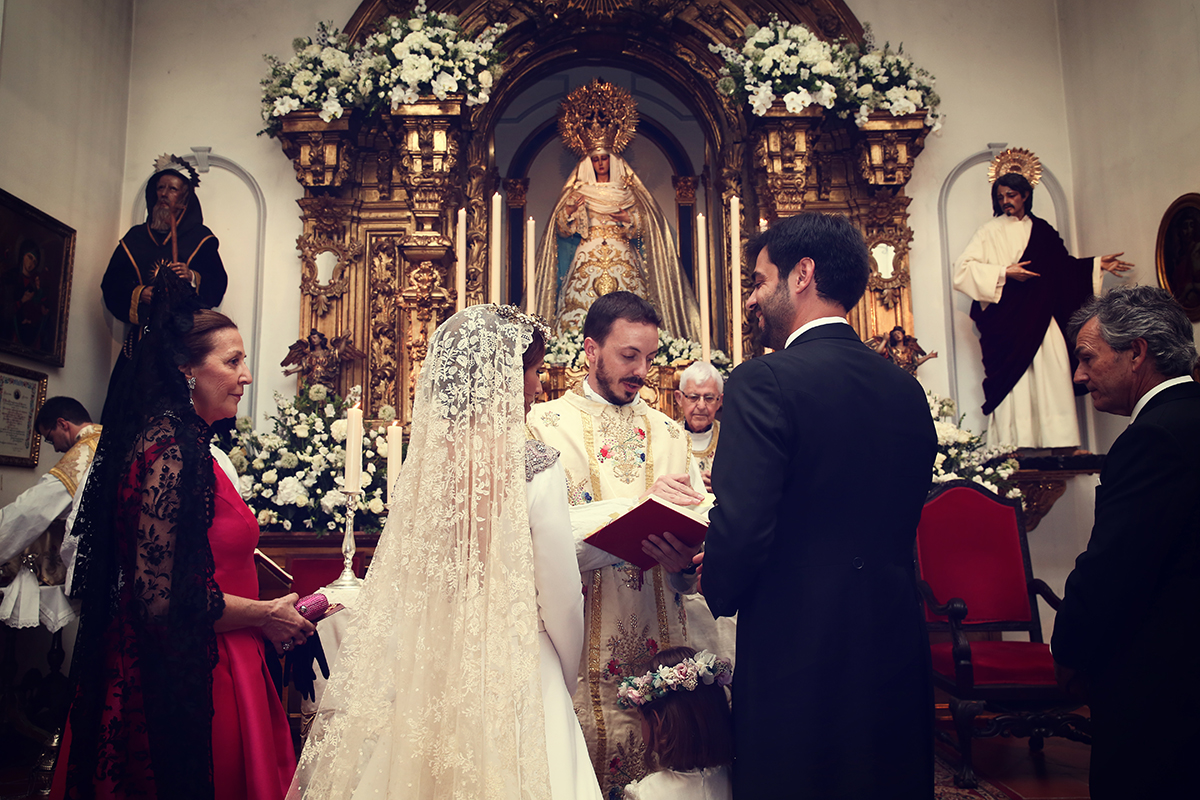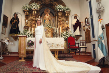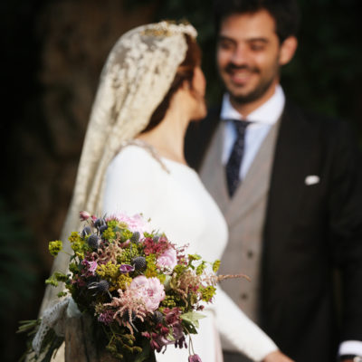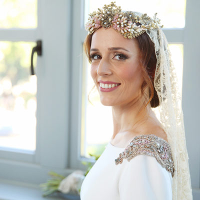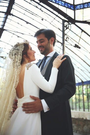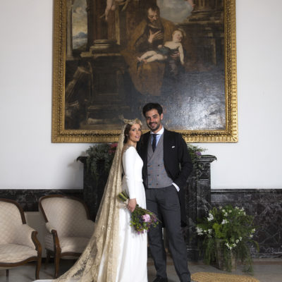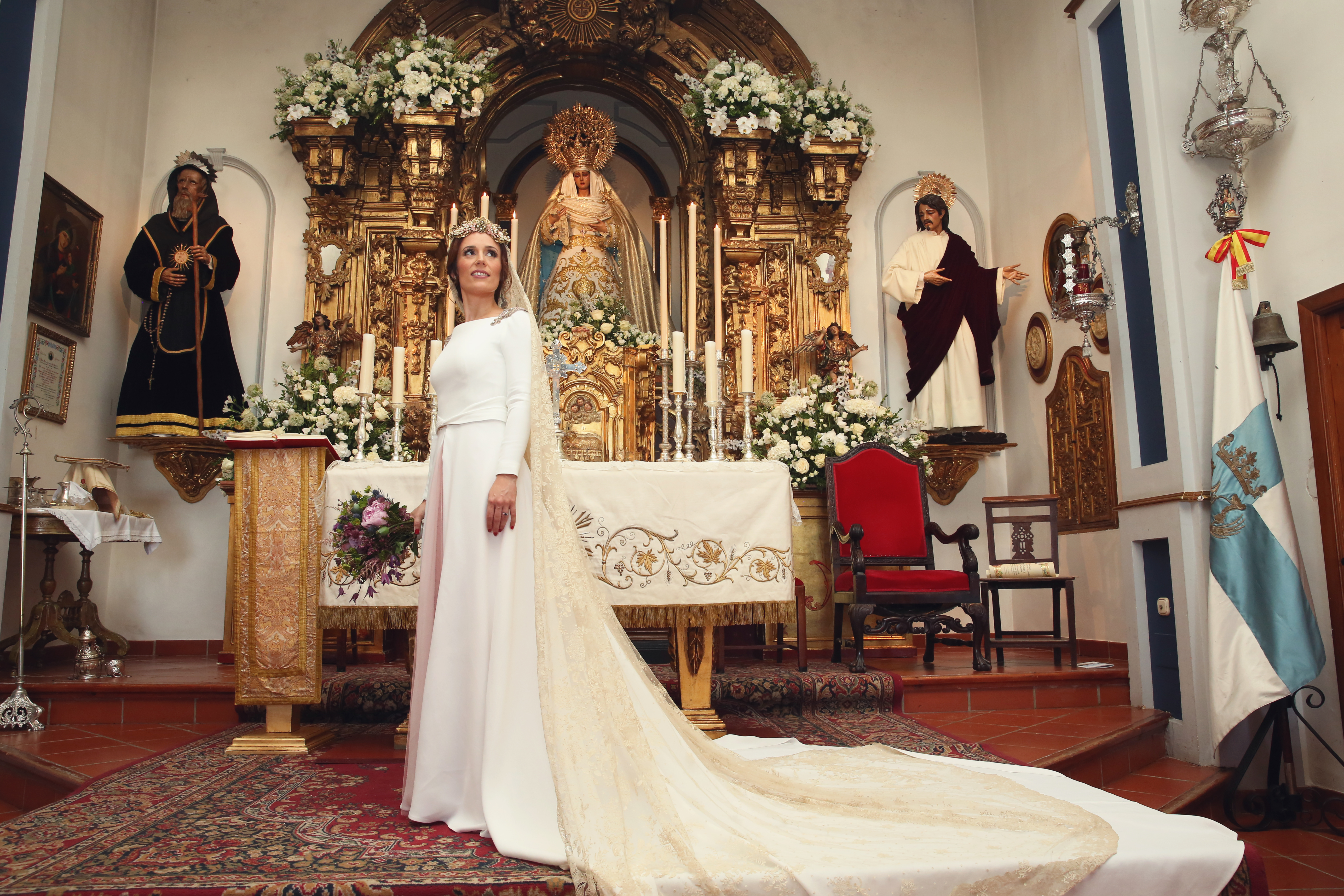 Un traje espectacular y lleno de detalles, rematado por una corona preciosa de Bambary y una mantilla de herencia familiar y de una calidad incalculable.